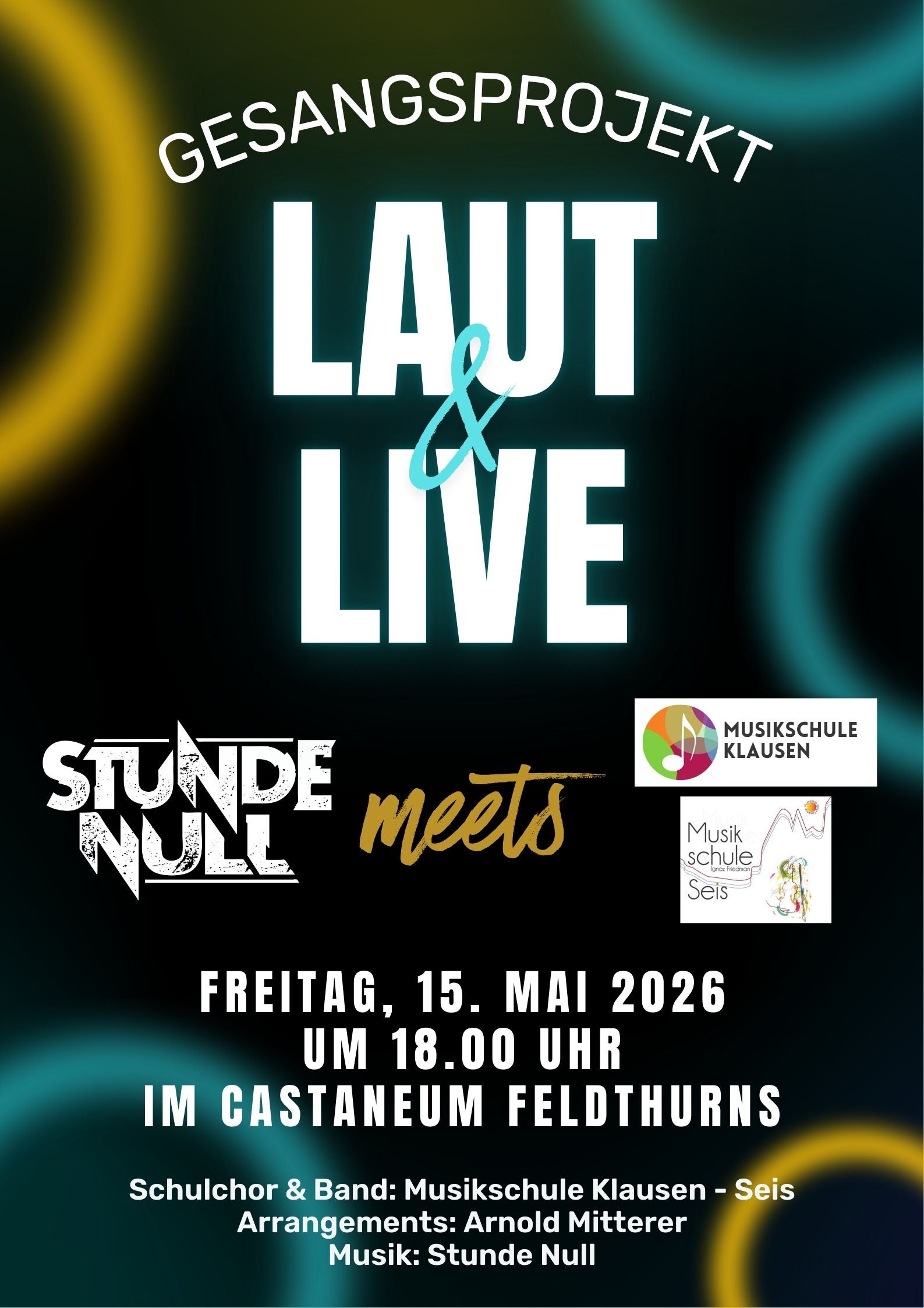 Das Konzert zum Gesangsprojekt Laut & Live - Stunde Null meets Musikschule Klausen - Seis findet am Freitag, 15. Mai 2026 um 18.00 Uhr im Castaneum Feldthurns statt.