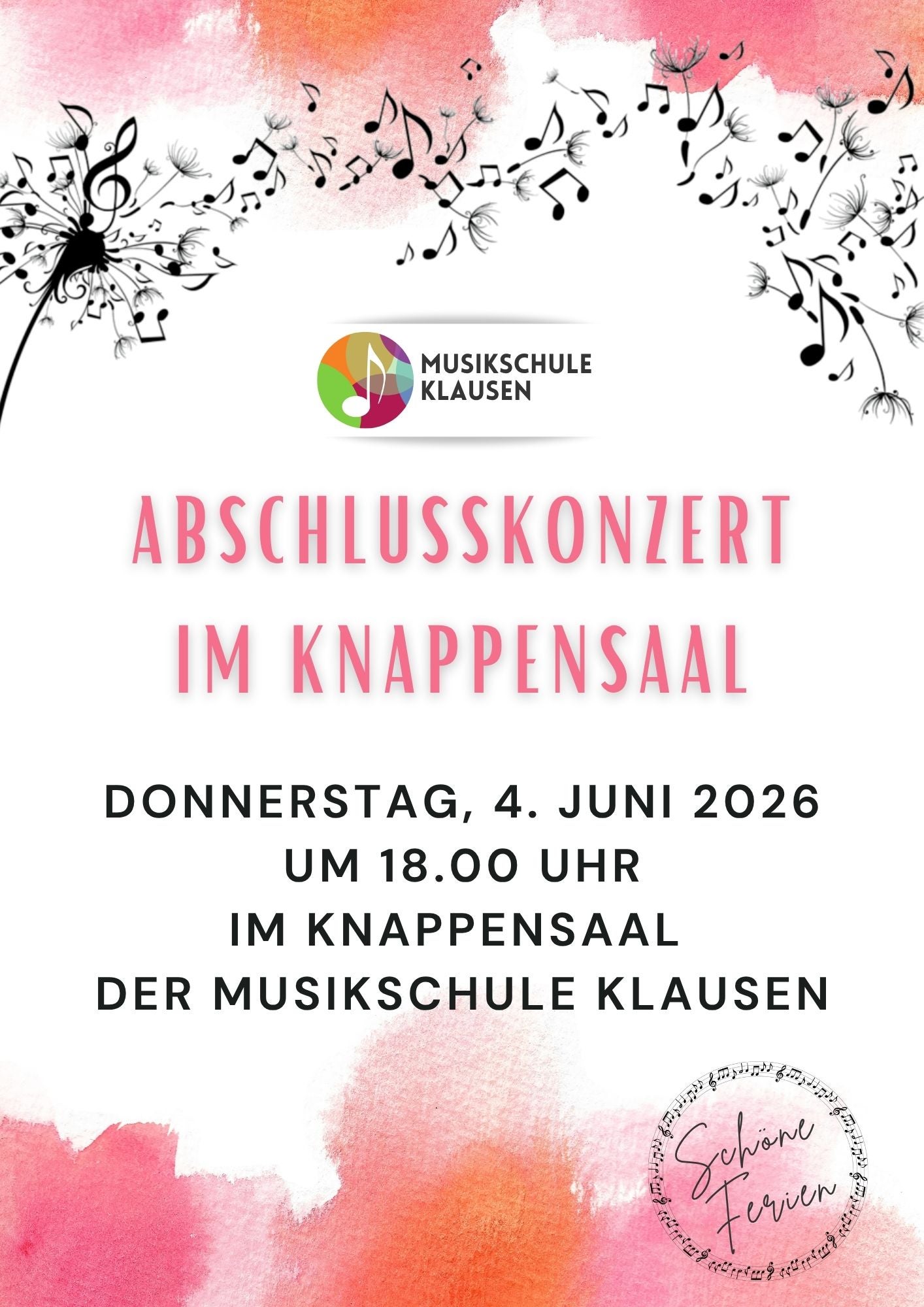 Das zweite Abschlusskonzert der Musikschule Klausen findet am Donnerstag, 4. Juni 2026 um 18.00 Uhr im Knappensaal der Musikschule Klausen statt.