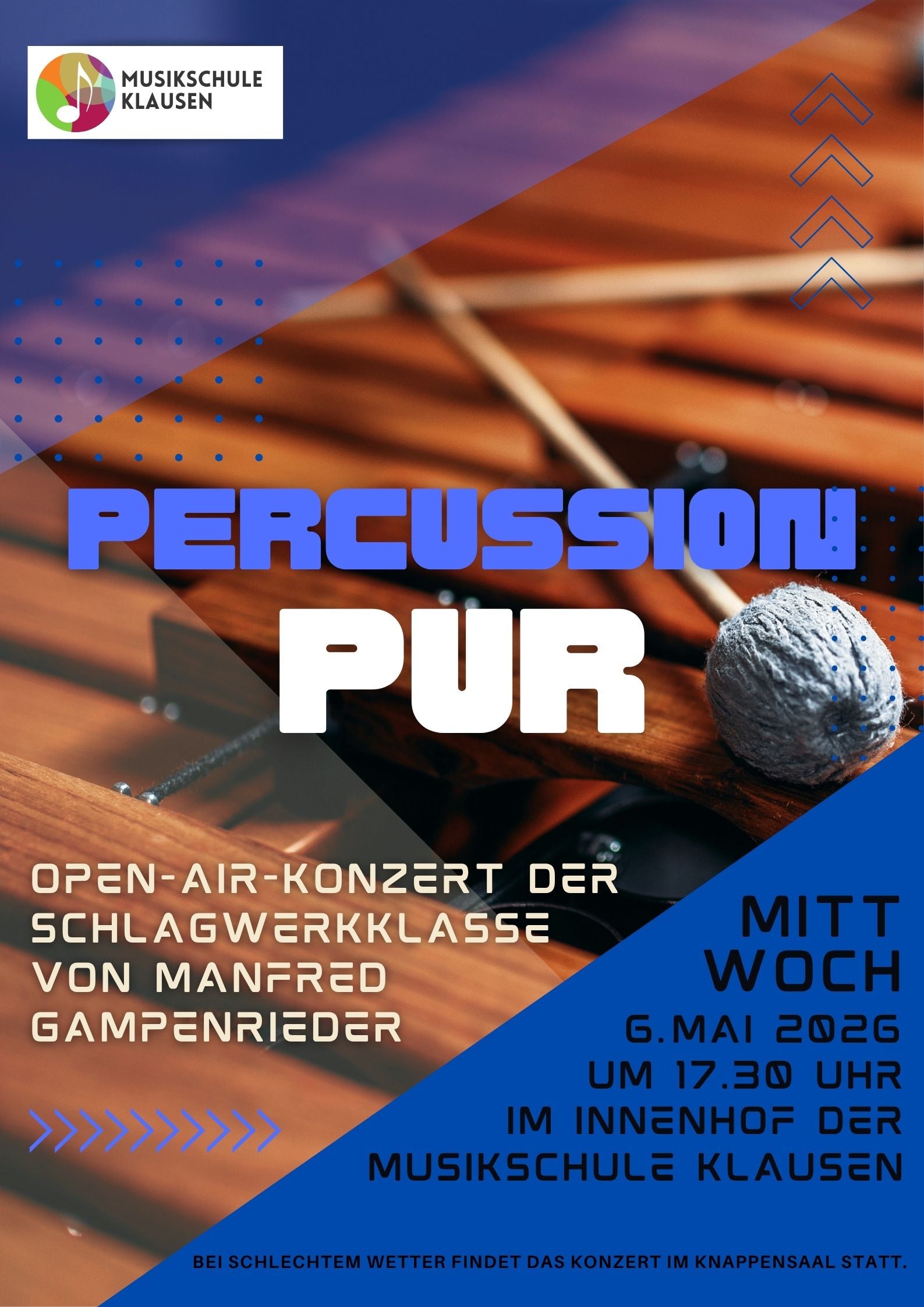 Am Mittwoch, 6. Mai 2026 um 17.30 Uhr findet das alljährliche Open-Air-Konzert der Schlagwerkklasse von Manfred Gampenrieder im Innenhof der Musikschule Klausen statt.