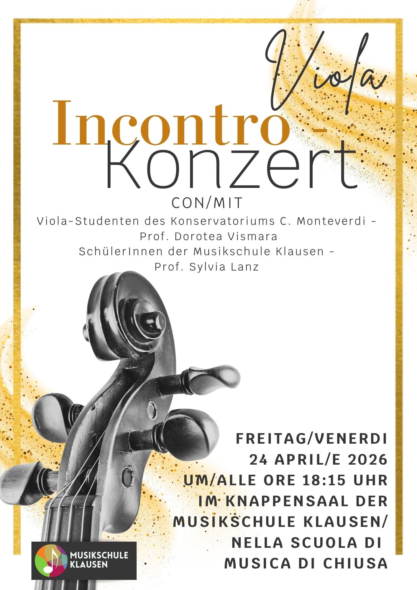 Am Freitag, 14. April 2026 um 18.15 Uhr findet im Knappensaal der Musikschule Klausen ein Konzert mit dem Namen Viola Incontro-Konzert statt mit Viola-StudentInnen des Konservatoriums C. Monteverdi - Prof. Dorotea Vismara und SchülerInnen der Musikschule Klausen - Prof. Sylvia Lanz statt.