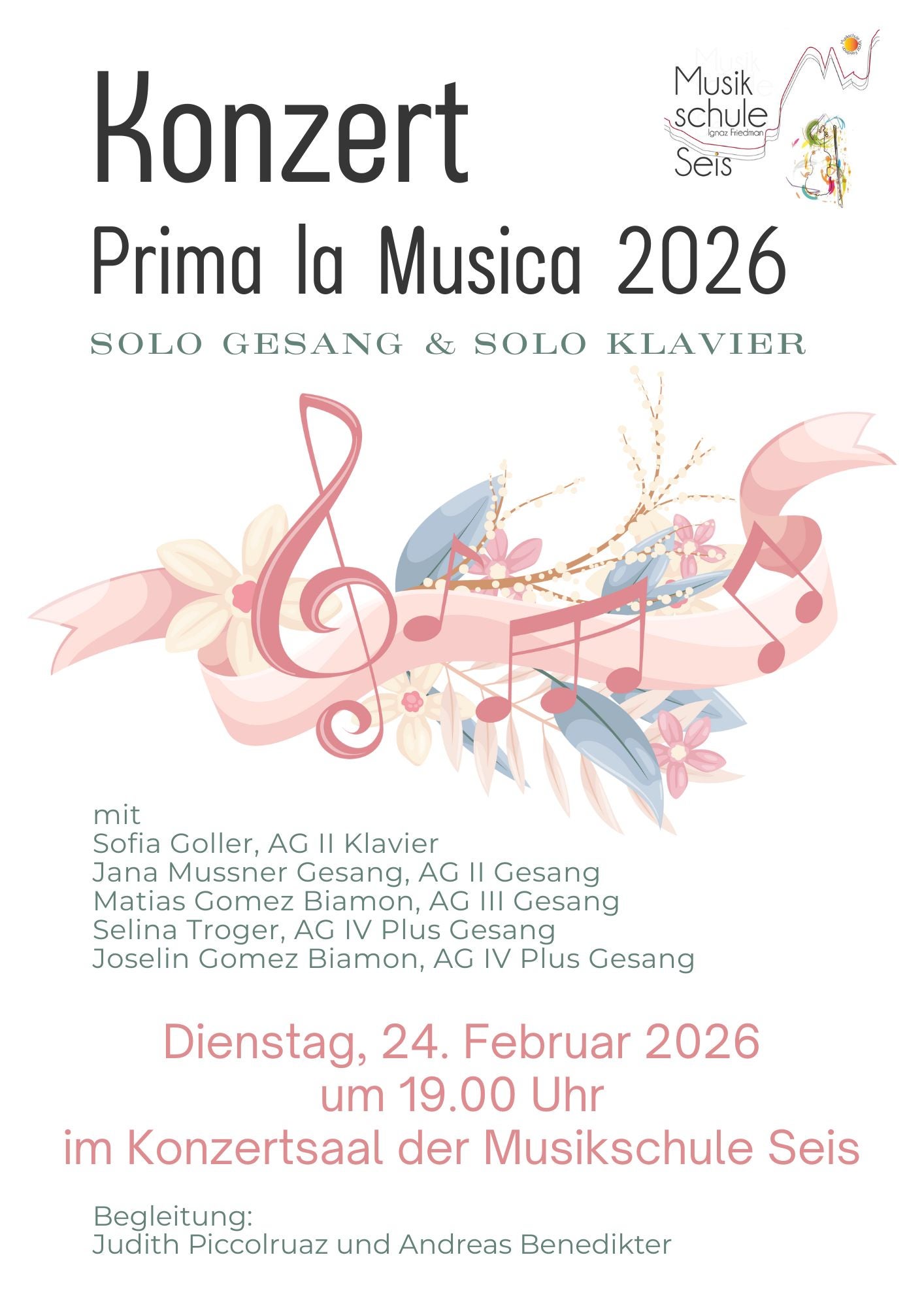 Musikschule Seis - Konzert Prima la Musica 2026 - Solo Gesang und Solo Klavier