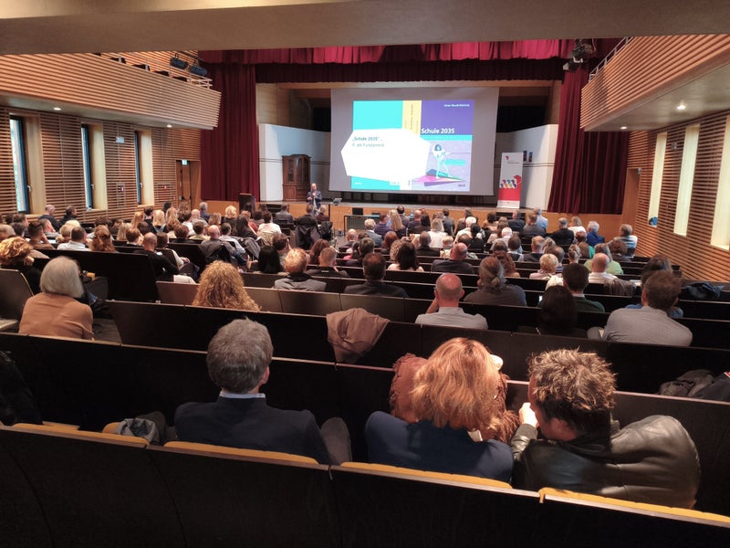 Diplom-Erziehungswissenschaftler Jöran Muuß-Merholz reiste in seinem Vortrag in die Zukunft und sprach von der Bildungslandschaft der Zukunft und vom Lernen nach Digitalisierung und KI. Er ist Autor des Buches "Schule 2035 – Lernen nach Digitalisierung & KI", das in Kürze bei Beltz erscheint. Darin werden fünf Schulen aus dem Jahr 2035 porträtiert, die jeweils sehr verschiedene Pädagogiken, Methoden und Technologien nutzen und sich auch in ihren Zielen und Werten stark voneinander unterscheiden. Die Debatte um Pädagogik und Technologie sei, betonte Jöran Muuß-Merholz, auf einer neuen, fortgeschrittenen Ebene zu führen.